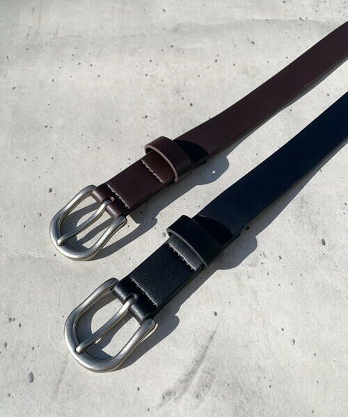細巾のナローベルトできれいめスタイルからカジュアルスタイルまで対応できる使い勝手の良いレザーベルトです。マットなバックルとナロー巾のデザインで癖のない雰囲気のためトップスのタックインスタイルにも最適です。