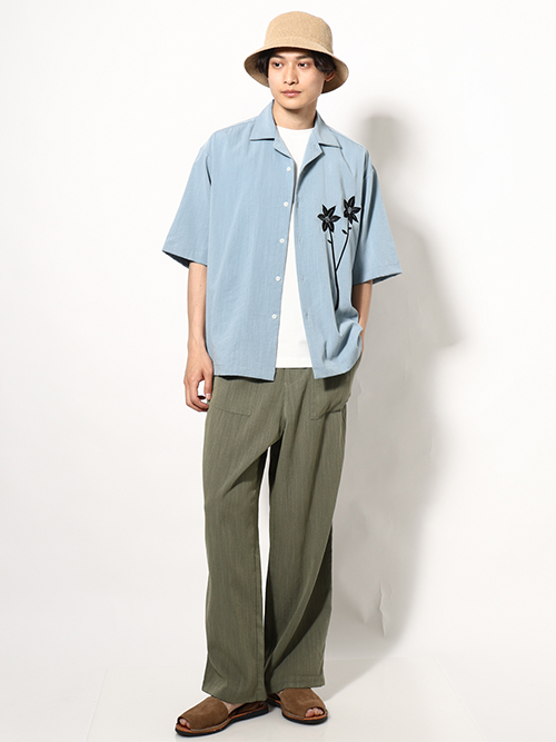 左身頃に繊細な刺繍で大きな花を施したオープンカラ—シャツ。