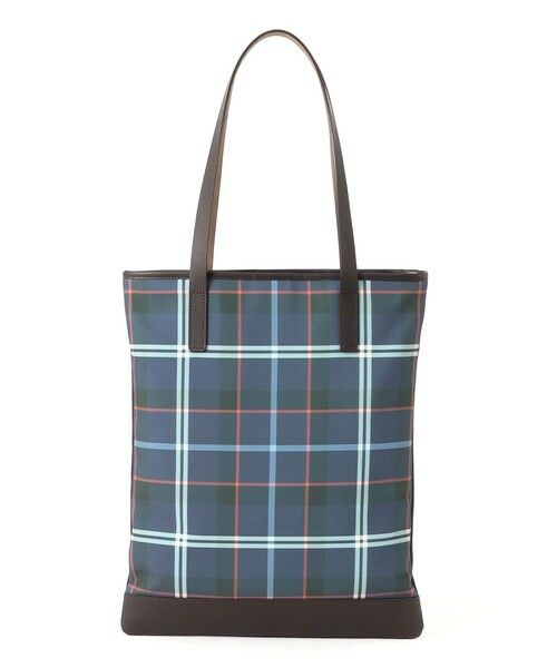 タフなポリエステルオックス地にブランドオリジナルのタータン柄を落ち着いた色目でプリントした、かさ張らず使い勝手の良い薄型トートバッグ。