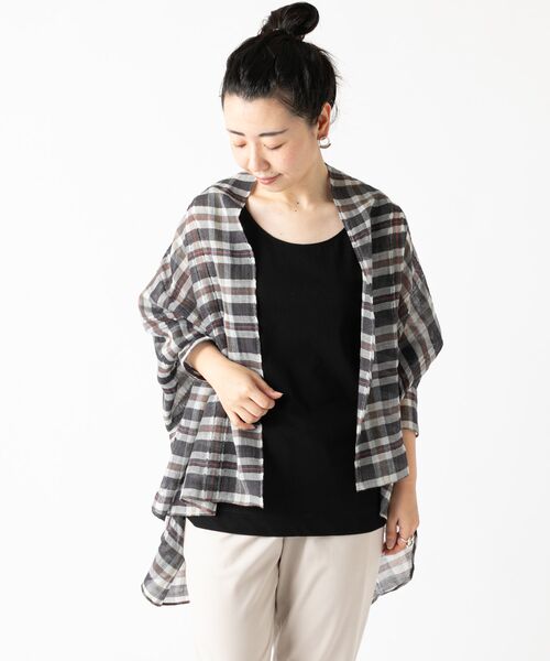 ストールのように軽く羽織れるハオリです。透け感のある薄手の素材で暑い時期の冷房対策にもおススメ。落ち着いた色味で涼しい気候になってきても重宝します。軽やかに揺れる裾の動きをお楽しみください。
