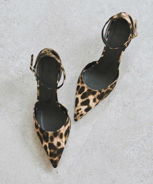 サテン素材のレオパードが目を惹くストラップパンプス。
