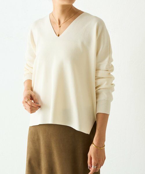 深めのVネックはデコルテ周りをスッキリ、綺麗にみせてくれます。