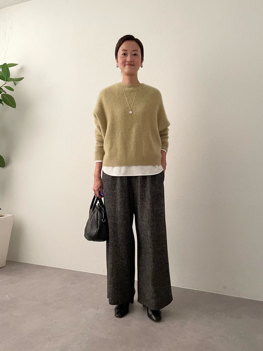 166cm ウェーブ イエベ秋 【ニット】Fサイズ ふわふわなfoxウール×柔らかなピンクで女性らしいニット。 前後着れるのでボタンを前にしてカーディガンとしても着れます。 すっきりした着丈なので、レイヤードコーデも楽しめます。 【Tブラウス】0サイズ着用 1枚で着るのはもちろん、これからの時期ニットにレイヤードしても楽しめます。 前後差のある着丈で裾がシャツカットになっているので重ねた時も簡単におしゃれ見えします。 【パンツ】2サイズ着用 カラーネップ生地のウエストリブパンツ。 つぶつぶとしたネップが表情がありシンプルコーデのポイントになります。 裏地付きで肌あたりも心配なしです。 166cmで2サイズ、くるぶししっかり隠れる長さです。