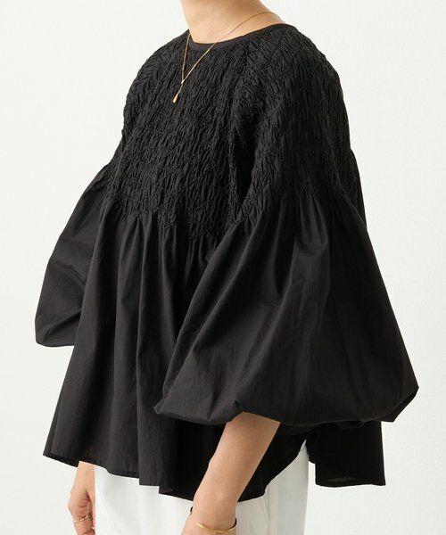胸元や肩回りにスモッキング刺繍を施したプルオーバーブラウス。
