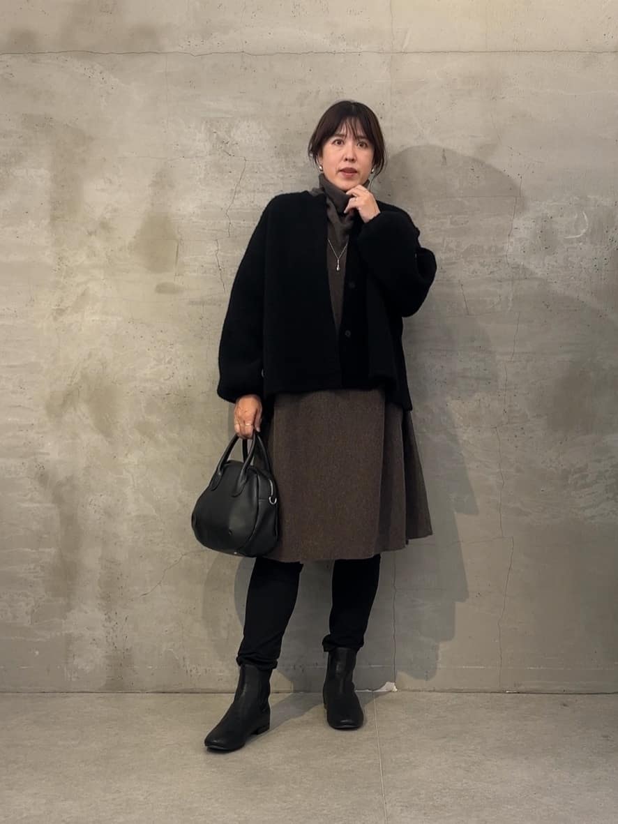 160cm ストレート イエベ春 2025.11.25 ◆パフ袖ウールニットジャケット(ブラック) きちんと感が欲しいアラフィフにちょうどいい一枚。肩まわりがラクだから、かしこまりすぎずに羽織れるのが助かります。 ◆タートルビッグニット(ロング/モカ) お腹まわりや腰まわりを自然にカバーしてくれる長め丈。優しいモカ色は顔映りも柔らかく、アラフィフの肌にもなじみやすい色味です。 ◆《FRIPIER》コットンパギンス(ブラック/1サイズ) 細身なのに伸びがあってラク。下半身に自信がなくてもブラックなら安心感あり。アラフィフ的には“ゴム仕様”ってだけで嬉しいポイント。 ◆レザーサイドゴアブーツ(ブラック/37サイズ) ペタンコすぎず、ヒールすぎず。アラフィフ世代が一番欲しい“歩きやすさとスッキリ見え”を両立してくれる一足です。