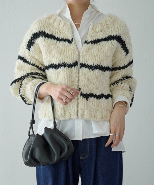 ほっこりしがちなざっくりニットも、オフホワイトにブラックのボーダーが入ることで甘くなりすぎず、こなれ感を演出。