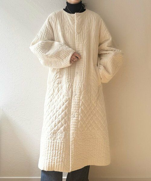 キルティング刺繍を施したベロア素材が目を惹く《15 quinze》のロングコート。
