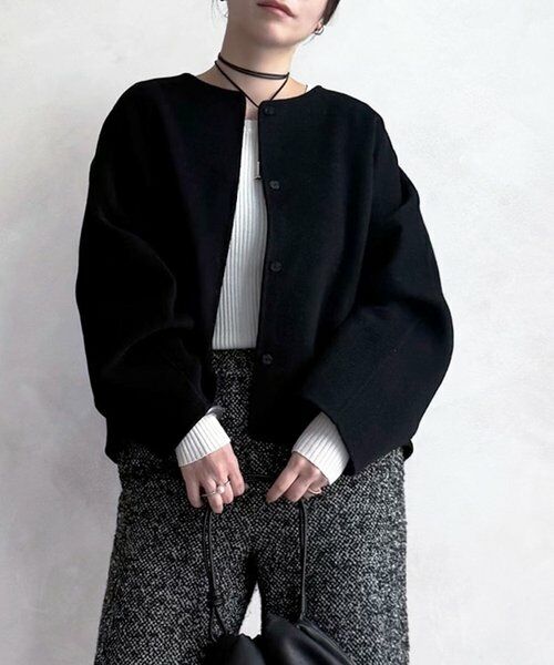ノーカラーのミニマルなデザインに、スナップボタンで表にボタンが見えない仕様が上品で、