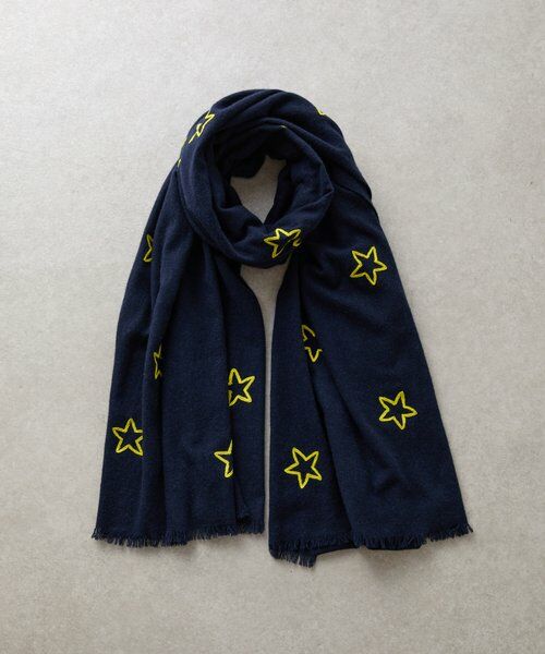 ネイビーのストールにイエローの星を大き目に刺繍した遊び心のあるストール。