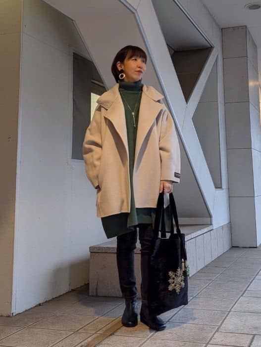 164cm ウェーブ イエベ秋 【コート】1サイズ着用 顔周りを柔らかく見せてくれるカラーはアラフィフ以上の方におすすめです。 アーム周りや身幅はゆったり。ヒップがしっかり隠れる着丈なので細身のパンツにはもちろん、ワイドパンツにもバランス良かったです! 前を閉じた時はマフラーいらず。開けたときと雰囲気が変わるところも良いですね。 私は手が長めなのですが、袖丈しっかりあるのも◎ 【ニット】 マントのようなフォルムが着映えするデザインです。 ゆったりしてますが、袖口をたくし上げるとスッキリと見えます。分量あるから重い?と思うかも知れませんが、フワッと軽い着心地なのです。 タートルの口も抜け感あるので、窮屈ではないですよ。 【パンツ】1サイズ着用 生地自体の伸縮性がしっかりあり、しかも柔らかいのでストレスフリーな履き心地です。 ピッタリしているのですが肉感を拾わない程よい厚みで安心感があります。 トップス長めのときやワンピースの下に履く用に1本持っておくと、重宝すると思います! 【ブーツ】37サイズ着用 リアルバイしましたが、1日中立っていても初日から全く痛くなりませんでした! 軽くて革が柔らかいところが◎ ややゆったりめのサイズ感です。 私は通常24cmの靴で、37は踵が少し抜ける感じがしました。でも36は厚手靴下だとキツく感じました。 私は靴下を厚めにすれば大丈夫でした!