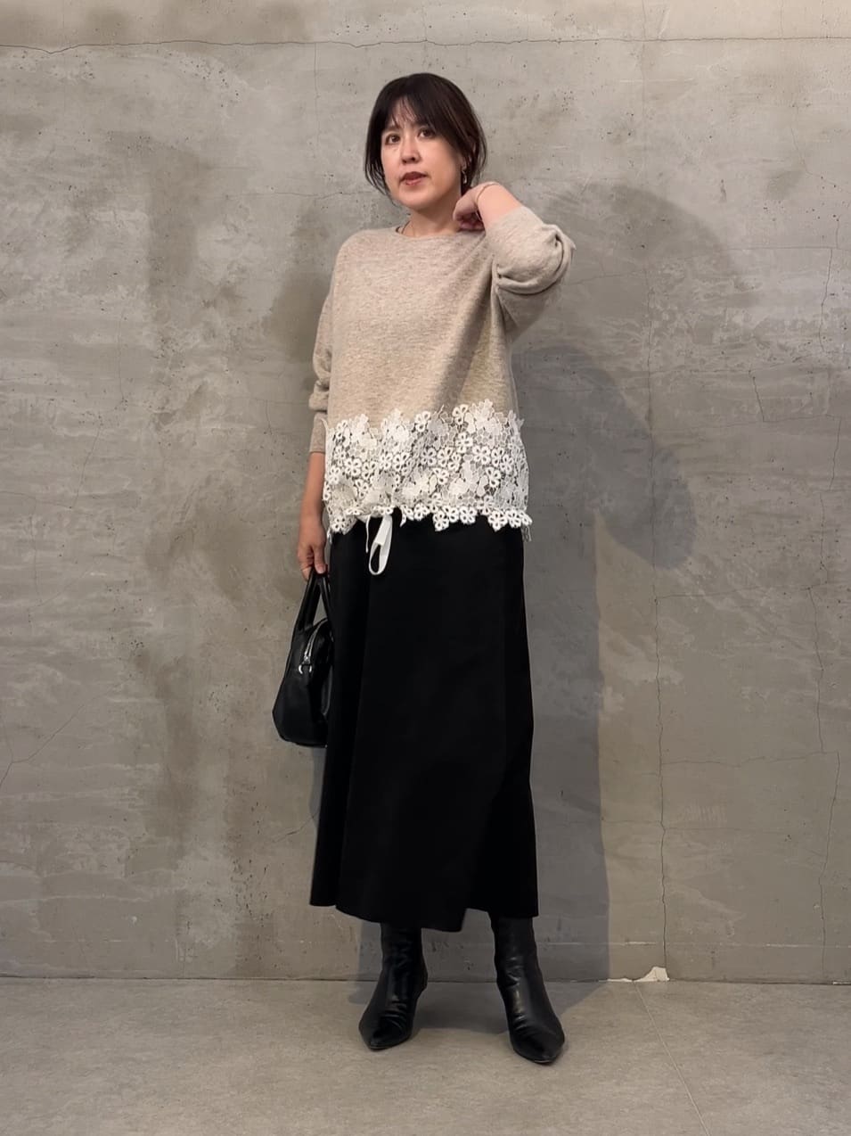 レースデザインならではの華やかさと、ニットの着やすさを兼ね備えた一枚です。