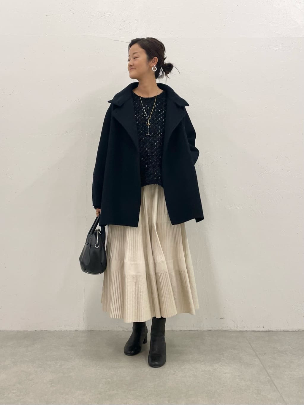 166cm ウェーブ イエベ秋 【コート】1サイズ着用 ドルマンスリーブで中に着るものを選ばない。 ボタンを閉めるとスタンドカラーになり首周り温かくストールいらずです。 ボタンは首周りだけなので、裾がスリットのようになりスカート合わせもバランス取りやすいです。 リバー仕立てなので早めの時期から春先まで時期長く着ていただけます。 裏地は肩から胸下あたりと腕に付きます。 【ニット】Fサイズ 立体的な編み地で表情のあるツイードニット。 ポリエステルの糸なのでご自宅で手洗い可能。 スカート、ワイドパンツなどボリュームのあるボトムともバランスが取りやすい◎ ニットですがウールを使っていないので手洗いできます。 同窓会や家族の集まりなどにもおすすめです。 手洗い可 【スカート】Fサイズ着用 プリーツ×ティアードでボリュームが出ない大人の上品スカート。 ウエスト周りには切り替えがなくすっきり。 裏地付きなのでアイボリーでも透け感なし◎ シワになりにくいのも嬉しいポイントです。