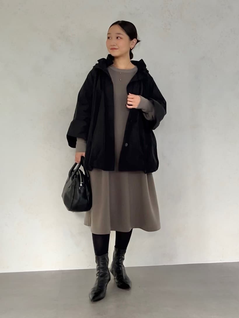 149cm ウェーブ イエベ春 【outer】着用サイズ:F 丸みのあるバルーンシルエットが魅力のブルゾン。ポケットに紐を通していてリボンがアクセントに。軽量かつシワを気にせず着られるので、折り畳んで旅行にも便利です。 149cmでお尻が隠れるくらいの着丈でした。 【one-piece】 しっとりもちもちのダンボール素材のワンピース。 被るタイプのワンピースでストレッチが効いていて、とにかく着やすいです。 透け感は全く無いので一枚でも安心。シワも気になりにくいのでお手入れ楽ちんです。 149cmで膝下くらいの着丈。 ヒールのブーツと小さめのバッグで、少しフォーマルにも使えるコーディネートです