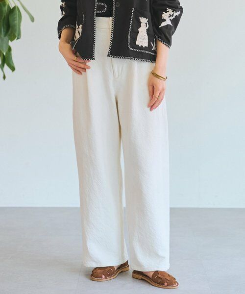フロントにはタックを入れ、前脇に沿ってステッチを施すことで、ワイドシルエットでも縦のラインが強調され、脚をまっすぐ長く見せてくれる効果も。