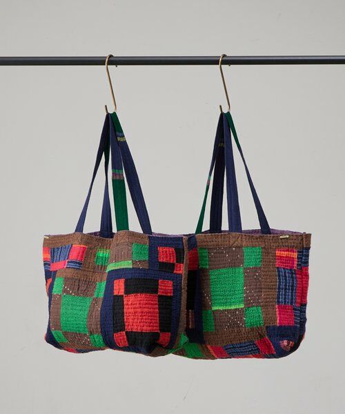 カラフルなウールやコットン生地をパッチワークにしたキルトトートバッグ。