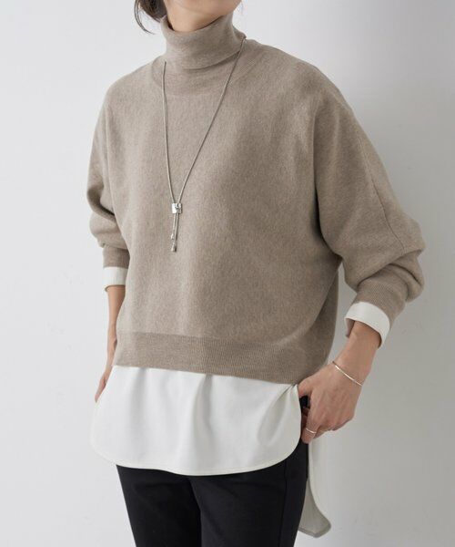 ベーシックな形で着回しやすい、ハイネックのドルマンニット。