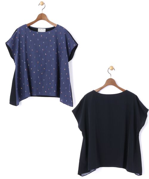 小さい人プリントが可愛い綿麻素材を前見頃に、柔らかなポリエステル素材を後ろ見頃に使用した異素材使いブラウス。ビアズリーが表現するスモールワールドの世界を詰め込んだデザインです。フレンチスリーブとサイドが長くなったゆるめのデザインがラフな雰囲気です。一枚で着ても、上からカーディガンを羽織っても可愛く着こなせそう。