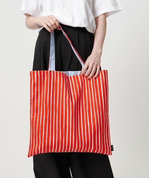 配色のストライプ模様がキャッチーな<marimekko>「Piccolo」柄の、日本限定トートバッグ。