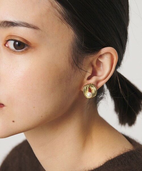 控えめなパールモチーフの輝きとメタルのコンビが、顔周りを印象的に彩ります。