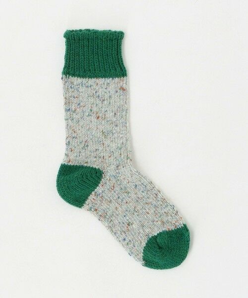 ウール混の暖かみあるネップ素材に、部分的にカラーブロッキングしたデザインが目を引くソックス。
