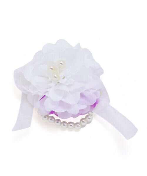 メインの白いお花の奥に紫の花びらがちらりと覗き、装いに深みのある華やかさをプラスします。