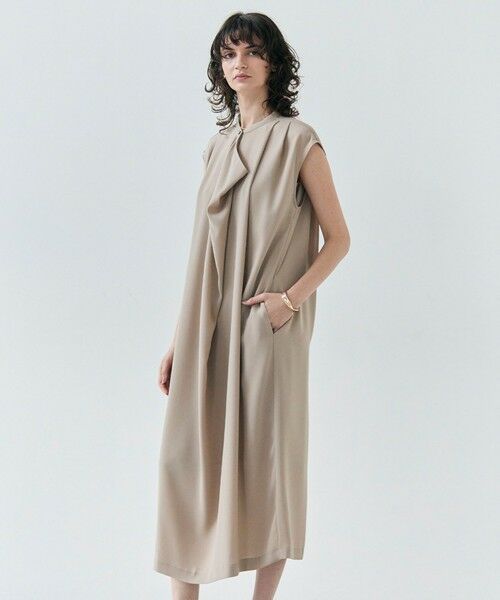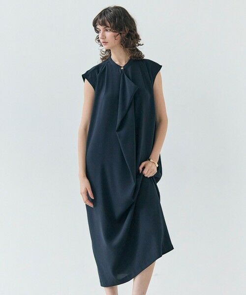 BEIGE、でご好評のとろみ素材に、今シーズンはフロントのドレープとタックが美しいノースリーブワンピースが登場。ノースリーブながら広めの肩袖で安心感があり、細めのバンドカラーと程よいゆとりが大人のこなれ感と上品さを両立するシルエット。上品なベージュとネイビーの2色展開で、単品ワンピースとして、お手持ちのジャケットやカーディガンに合わせてオフィスから普段使い、お出かけまで幅広いシーンで着回せるワンピースです。