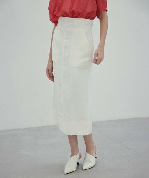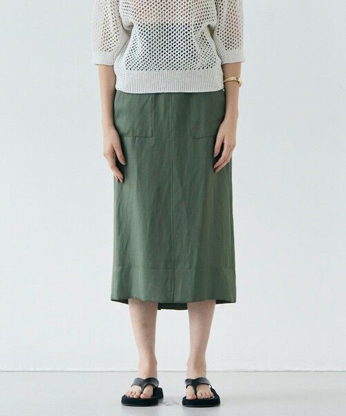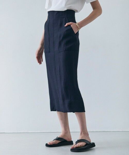ハイウエストのミモレ丈スカート。すっきりとしたIラインに大きめのアウトポケットが程よく腰回りをカバーし、背中のゴールドファスナーがポイントになる上品カジュアルなシルエット。後ろベントがタイトながら足さばきを良くし、ハイウエストがトップスインでもアウトでもバランスよく見せてくれます。メランジホワイト、オリーブ、ネイビーの上品な色合いが使いやすく、同素材のブルゾンと合わせたマニッシュな着こなしはもちろん、甘さのあるブラウスやトップスにも合わせやすく程よいカジュアルさを加える大人のリネンスカートです。