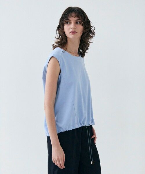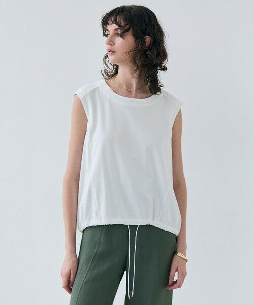 程よく肩が隠れるクルーネックトップス。すっきりとしたノースリーブに、柔らかな丸みと裾のドロスト使いでシルエットに変化が出るデザイン。ドロストを絞らずタイトボトムに、絞ってすっきりとしたメリハリを楽しんだりと幅広いコーディネートに着回せます。白とサックスブルー、スレートグレーの色合いが春夏を爽やかに彩り、暑い季節も涼しく着られるトップスです。