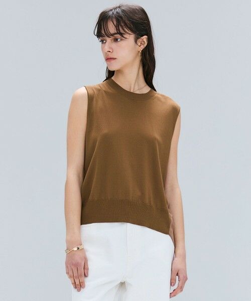 ベイジ、でご好評の定番素材に、ふわりと揺れるシフォンの異素材コンビニットが登場。肌離れの良いさらりとした素材が春夏に涼しく、襟ぐりと裾のスリットから覗くジョーゼットがさりげない抜け感を加えたデザイン。コンパクトな前身頃にバックスタイルは腰にかかる長めの着丈で腰回りはすっきりと、1枚はもちろん同素材の半袖カーディガンとのアンサンブルでより洗練された統一感のあるスタイリングに。スカートと合わせたしなやかで女性らしい装いや、パンツと合わせた知的で洗練された雰囲気など、オフィスから週末のリラックスタイムまで、あらゆるシーンで着回せるトップスです。