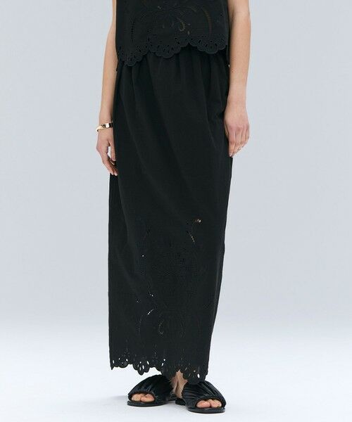 オリジナル刺繍が美しい、ウエストゴム仕様のロングスカート。イージーなウエストラインで腰回りは楽に、Iラインですっきりとしたシルエット。軽やかな麻調素材が春夏に涼しく、短めにカットされた裏地と刺繍で肌が透ける女性らしいデザイン。お仕事やオフィスに同素材のブラウスに合わせてワンピース風の着こなしや、Tシャツやカットソーと合わせてカジュアルダウンしたスタイリングにも、程よくエレガントさを加えてくれる1枚。デイリー使いはもちろん、ちょっとしたお食事会などきれいめな装いが求められるシーンにも活躍してくれるスカートです。