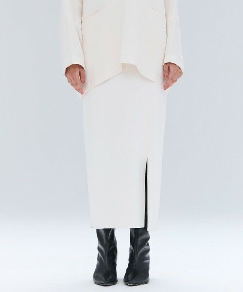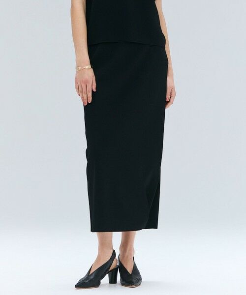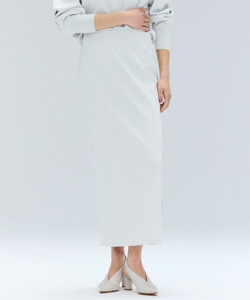 毎シーズンご好評をいただいているストレッチニットに、タイトなロングスカートが登場。ドライタッチのさらりとした肌触りが心地良く、ニットならではの程よい厚みで1枚でも美しいシルエット。裾のスリットが歩くたびに女性らしい抜け感を演出し、同素材のトップスとセットアップでエレガントに、カジュアルなブラウスやトップスとも相性抜群。クリーンなオフホワイト、上品なライトセージ、そして着回し力抜群のブラックの3色展開で、オフィスシーンからデイリースタイルまで様々なコーディネートに上品さを加えるニットスカートです。