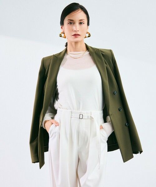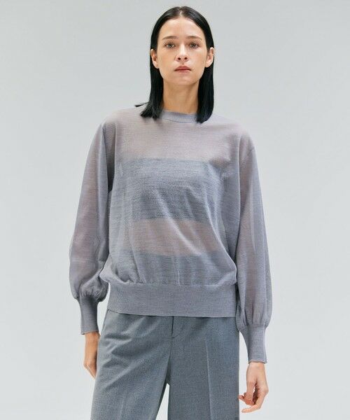 繊細な透け感が美しいシアーニットトップス。シンプルなネックラインながら袖に施されたギャザーがさりげない動きのあるデザイン。ウールの上質な肌触りと程よいハリが身体のラインを拾いすぎず、夏にも涼しくロングシーズン着回せる1枚。キャミソールやベアトップとレイヤードして、ジャケットやジレのインナーとしても活躍し、オフィスからカジュアルまで幅広いコーディネートに着回せる、大人女性のワードローブに欠かせないシアーニットです。