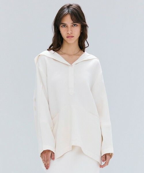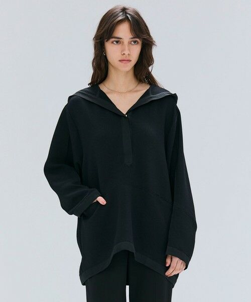胸元の深めなV開きが、大人のこなれ感を演出するフード付きトップスです。カジュアルな見え感ながらカーディガンのように軽く、別布の前立てには上品なゴールド釦をプラスし、顔周りを華やかに上品に着こなせる1枚。ヒップにかかる長め丈と丸みのあるフードが後ろ姿まで美しく、合わせるボトムも幅広くデイリースタイルを格上げします。暑い時期には1枚で、ゆったりとしたサイジングでタートルネックやカットソーのレイヤードスタイルもおすすめです。