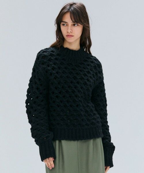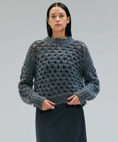 エッジーな編み地のニットトップスが登場。迫力のあるメッシュ編みを活かした立体的な存在感があり、アルパカ混の柔らかな糸を使用することで、見た目に反して驚くほど軽く、暖かな着心地に。シンプルなデザインながらも、編み地から覗くインナーとのレイヤードを楽しんだり、中にタートルネックなどを合わせることで様々な表情を見せてくれます。パンツスタイルでクールに、スカートで女性らしさをプラスするなど、合わせるボトムスを選ばず、幅広い着こなしに対応。いつものコーディネートにプラスするだけで、ぐっと垢抜けたスタイルが完成するニットです。
