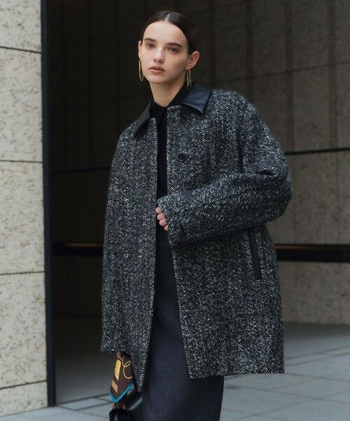 いつものコーディネートを格上げする、ステンカラーコートが登場。上質なツイードに襟とポケットをフェイクレザーで切り替えた異素材ミックスデザイン。柔らかな丸みを持たせた計算されたコクーンシルエットが、ボリュームがありつつも軽やかな印象を演出します。重ね着しやすいゆとりのあるラインで、ざっくりニットなどのレイヤードもしやすく、デニムでカジュアルダウンしたり、きれいめパンツと合わせてシックに着こなしたりと、幅広いアレンジに。オフィスにも馴染む上品さがありながら、カジュアルになりすぎない洗練されたデザインを感じるアウターです。