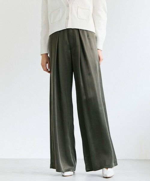 脚のラインを拾わない美しいドレープが魅力のワイドパンツ。ボックスタックと脇から内側にカーブを描く独特のシルエットが、他にはない洗練されたシルエット。ツヤのある素材がシンプルなトップスと合わせるだけで着こなしを格上げし、オフィスやデイリーカジュアル、少し気分を上げたい日にもシーンを選ばず着回せるワイドパンツです。