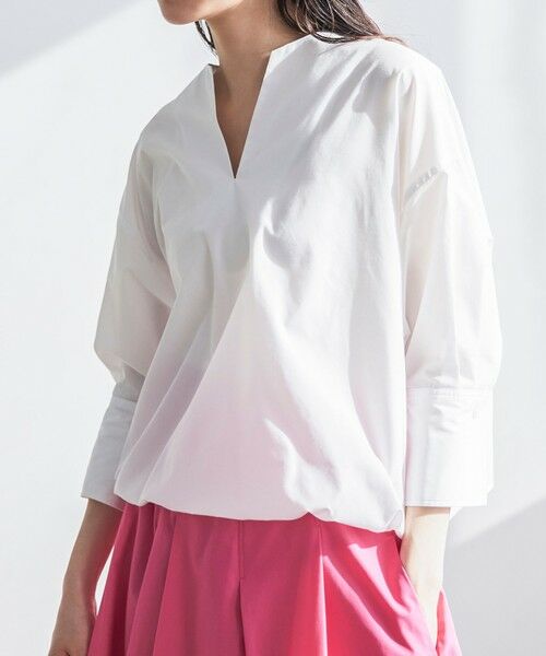 ゆったりとしたシルエットのVネックブラウスは、カジュアルな中にも品格を感じさせるデザイン。