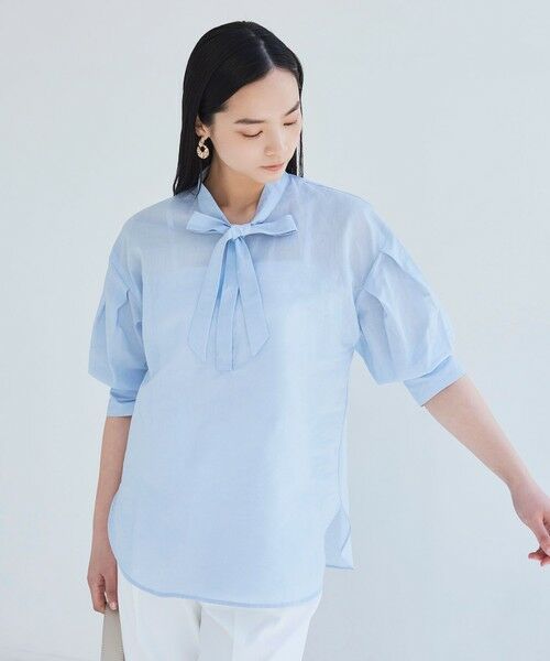 トレンドのボウタイを軽やかなシアー素材で表現したブラウス。自然なシワ感と紙ならではの軽さが、暑い日でも快適な着用感を実現。きちんと感と涼しげな印象を両立させた、夏のオフィススタイルにぴったりのアイテムです。