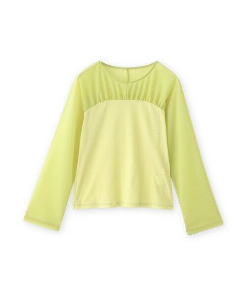 肩から袖にかけてのシアー素材が、さりげなく肌見せを叶えるトレンド感のあるデザイン。胸元のギャザーディテールが、着た時のボディラインをきれいに演出します。ジャージ素材とシアー感のあるチュール素材を組み合わせたコンビデザインで、1枚で着てもサマになり洗練された印象に。大人の女性の日常使いにぴったりの上品さと今っぽさを兼ね備えています。