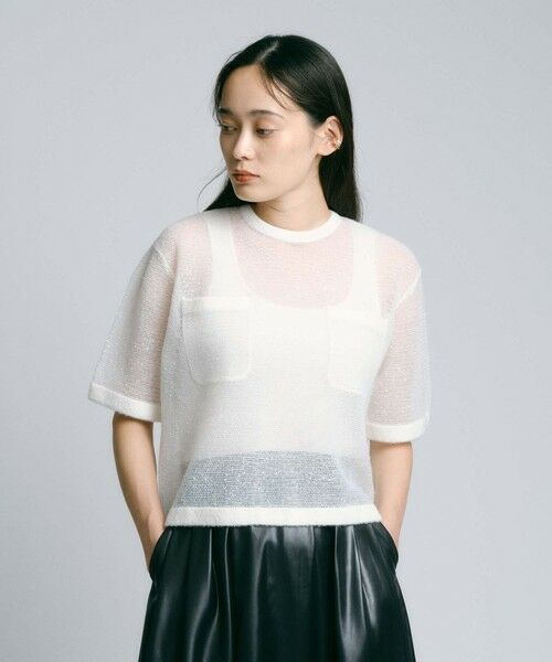 超細番糸をブレンドした花式ループ糸を使用したシアー素材です。透明糸と接結編みの技術により、長時間着ていても?ヨレにくく?美シルエットをキープ。触れたくなるような上質な肌触りです。
