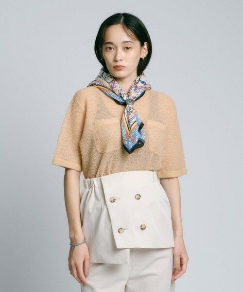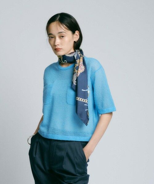 シアー素材をエレガントに昇華したニットプルオーバー。ツイード見えするループヤーンの編地が目に留まる高級感を演出。ややボクシーなシルエットで体型カバーしながらも抜け感のあるニュアンスを残し、ポケットデザインが効いた?ひとクセある?大人の装いに。ホワイト・ブルー・オレンジは同色のトリミングでさりげないアクセントに。ブラックには白のトリミングを効かせ、ややクラシカルな印象に仕上げました。