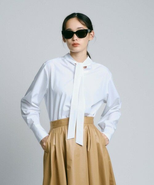 トレンドのエッセンスを加えたボウタイディテールのブラウス。前後どちらを前にしても着用できる2WAYデザインです。エレガントな大きめのボウタイと、知的な印象のスタンドカラー、その日の気分やコーディネートに合わせて着こなしを変えられます。インナー使いもしやすく、ジャケットやカーディガンとのレイヤードスタイルもきれいめに決まります。