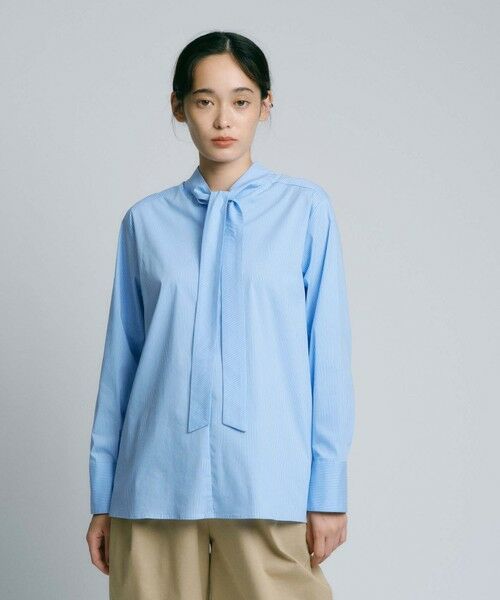 トレンドのエッセンスを加えたボウタイディテールのブラウス。前後どちらを前にしても着用できる2WAYデザインです。エレガントな大きめのボウタイと、知的な印象のスタンドカラー、その日の気分やコーディネートに合わせて着こなしを変えられます。クラシカルなストライプ柄が、爽やかで洗練された雰囲気に仕上げてくれるのもポイント。インナー使いもしやすく、ジャケットやカーディガンとのレイヤードスタイルもきれいめに決まります。