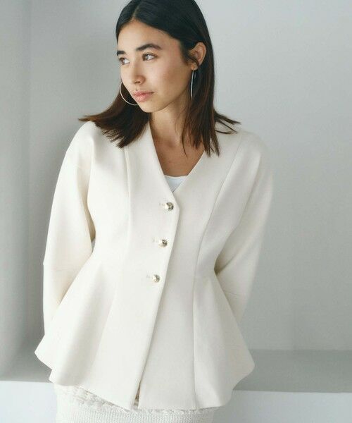 ジャージー素材の伸縮性とフィット感がありながらも、きちんと感をあわせ持つジャケット。袖のボリューム感とウエスト切り替えのペプラムデザインが、エレガントさを引き立てるシルエットに仕上がっています。光沢感のあるボタンもアクセントに。深めのV開きデザインで、カラーニットとレイヤードさせても着映えが叶います。ニュアンスのある上品なカラー展開も魅力です。