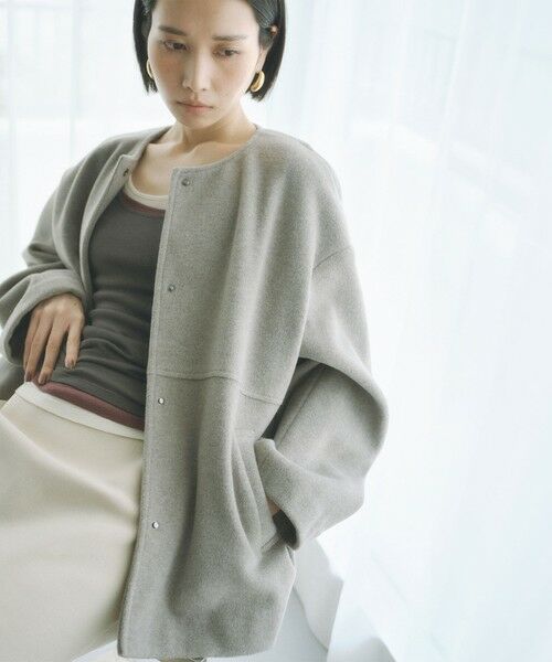 ややコクーンのシルエットで気軽に羽織りやすいコートです。真冬の本格的なコートほどの厚みがない分、車での移動や暖房のきいた室内で着るのにもおすすめで、長いシーズン活躍する便利アウターです。腰にかかるくらいの着丈なので、スカートにもパンツにも合わせやすいのも活躍ポイント。ドロップショルダーでゆとりのあるシルエットなので、中に厚みのあるニットを着てもOKです。