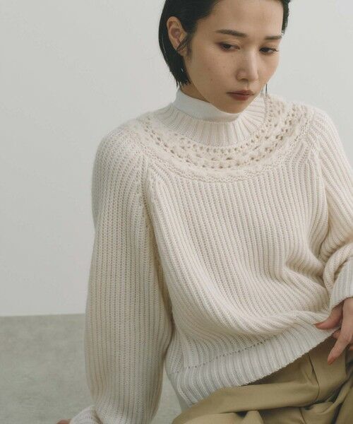 ヨーク部分のさりげない透け感が冬のコーディネートに抜け感をプラスしてくれます。1枚で着映えするので、長めのスカートでエレガントに着たり、デニムでカジュアルに合わせたり、ON/OFF問わず活躍してくれそうです。明るめのカラー展開なので、春先の寒い時期にもおすすめです。