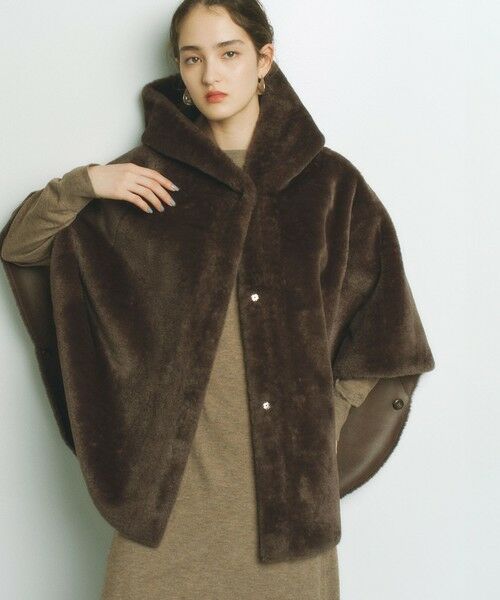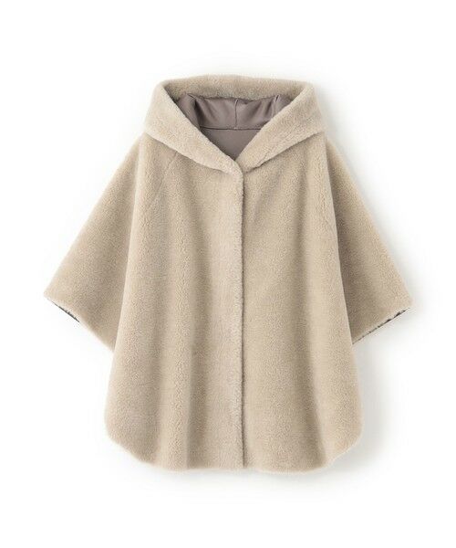 さらっと羽織れるフード付きのリバーシブルポンチョ。気分やスタイリングに合わせて、ファーの面を表にしたり、フェイクスエードの面を表にしたり、両面での着こなしが楽しめます。袖下部分をボタンで留めているので、腕を通した時のおさまりも良く、コート感覚で着ていただけます。
