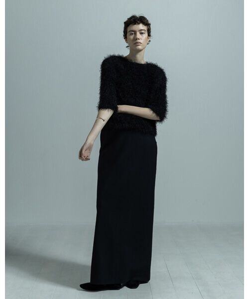 毛足感のあるニット糸で編み立てた、クルーネックニットトップス。