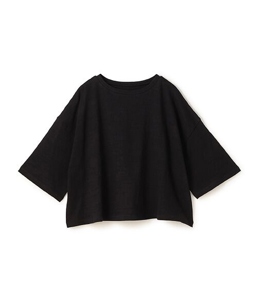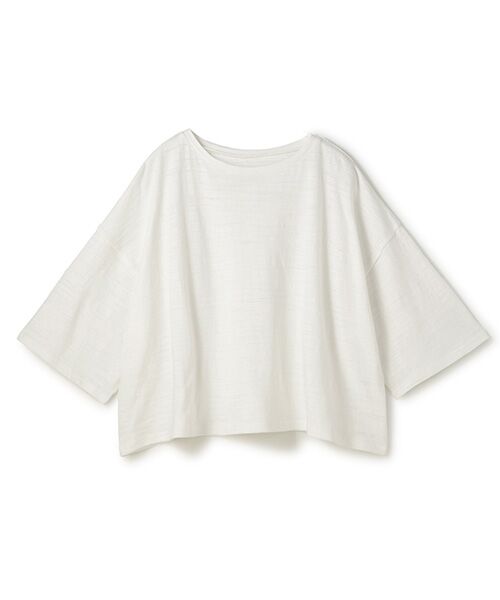 ボクシーシルエットのショートスリーブプルオーバー。女性らしいショート丈とボクシーシルエットの絶妙なバランスがナチュラルな抜け感を表現します。袖をあえて長めの5部袖に設計することで、腕周りの気になる部分をカバーしながら、ドロップショルダーのゆったりとしたシルエットとのメリハリをつけました。分量感がありながらもコンパクトなショート丈はワイドボトムとの相性が良いです。一枚での着用はもちろん、シャツやカットソーを襟や裾から覗かせたレイヤードスタイルもおすすめです。