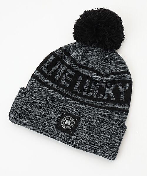 トップのポンポンがポイントのニットキャップ。ブランドコンセプトである「Live Lucky」がジャガードで織り上げられているのが特徴です。